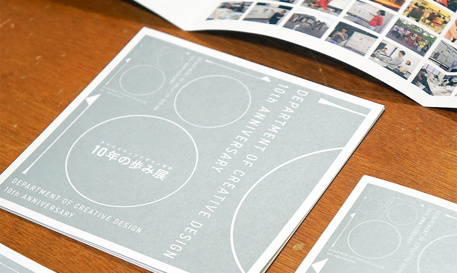 卒業制作展と同時開催で、クリエイティブデザイン学科10周年を記念した展示会を開催。プロダクトデザイン/ビジュアルデザイン/エクスペリエンスデザインの3コースの特徴的な教育内容の成果を展示した。