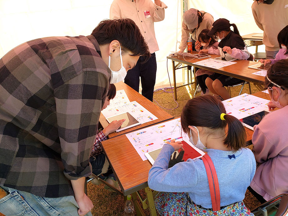 2023年4月23日(日)八木山のtbc東北放送構内にて開催された『tbc桜まつり2023』において、産業デザイン学科 坂川 侑希 講師と研究室の学生3名が、iPadとScratch Jr.を用いた『こどもプログラミング体験』を行いました。体験にはのべ30名ほどが参加し、子供たちはとても楽しそうにプログラミングに取り組んでいました。