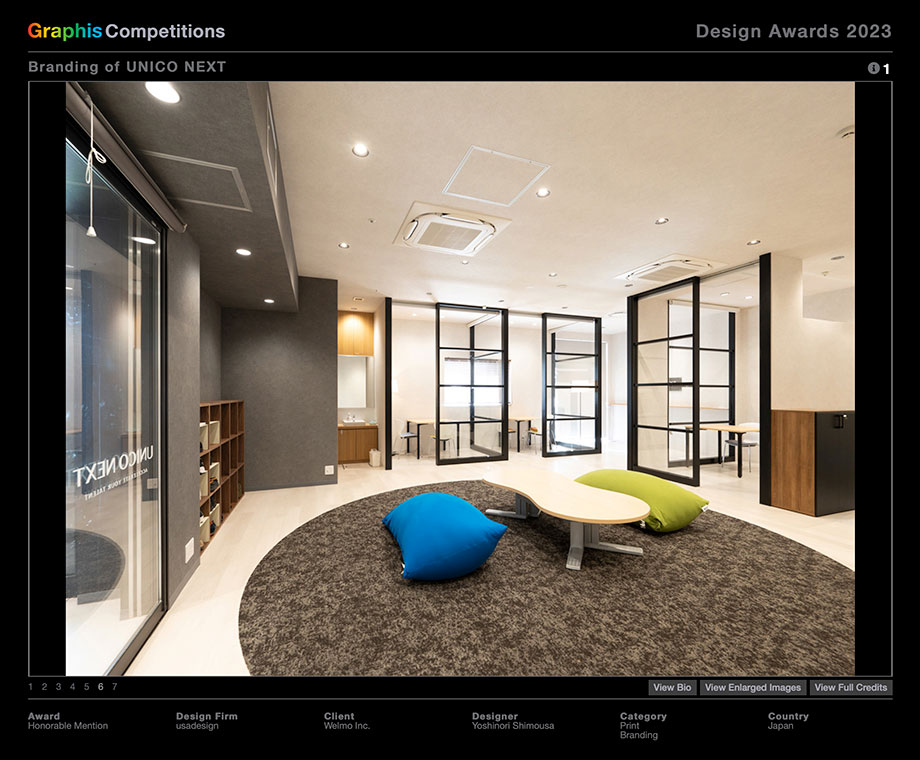 下總 良則 准教授がアートディレクションを担当した「UNICO NEXT(*)博多教室の内装デザイン」が、国際グラフィックデザインコンペ「Graphis Design Annual 2023」で、Honorable Mentionに選ばれました。