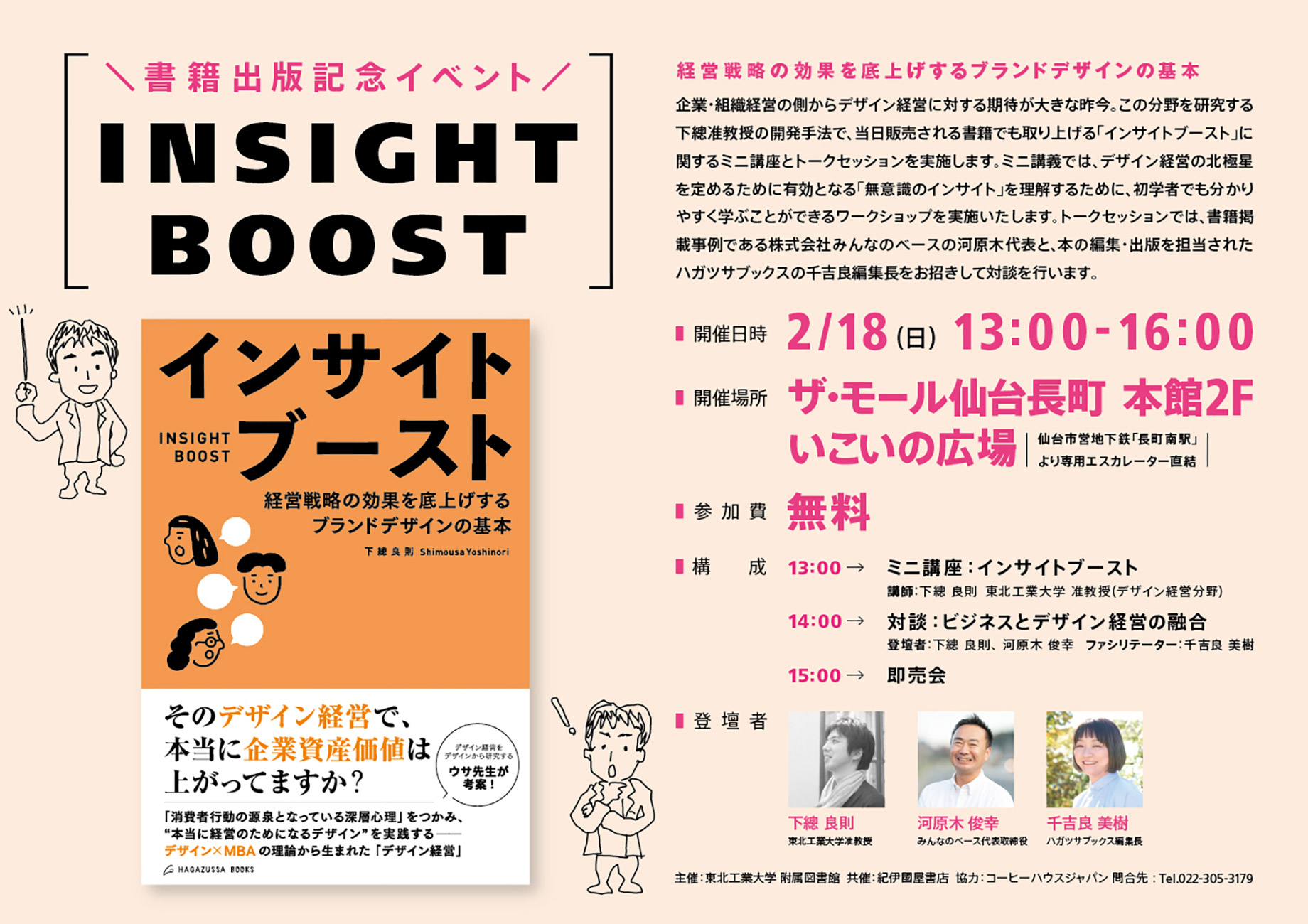 2024年2月18日(日)、ザ・モール仙台長町にて産業デザイン学科 下總 良則 准教授の著書出版記念イベント「INSIGHT BOOST~経営戦略の効果を底上げするブランドデザインの基本~」を開催いたします。