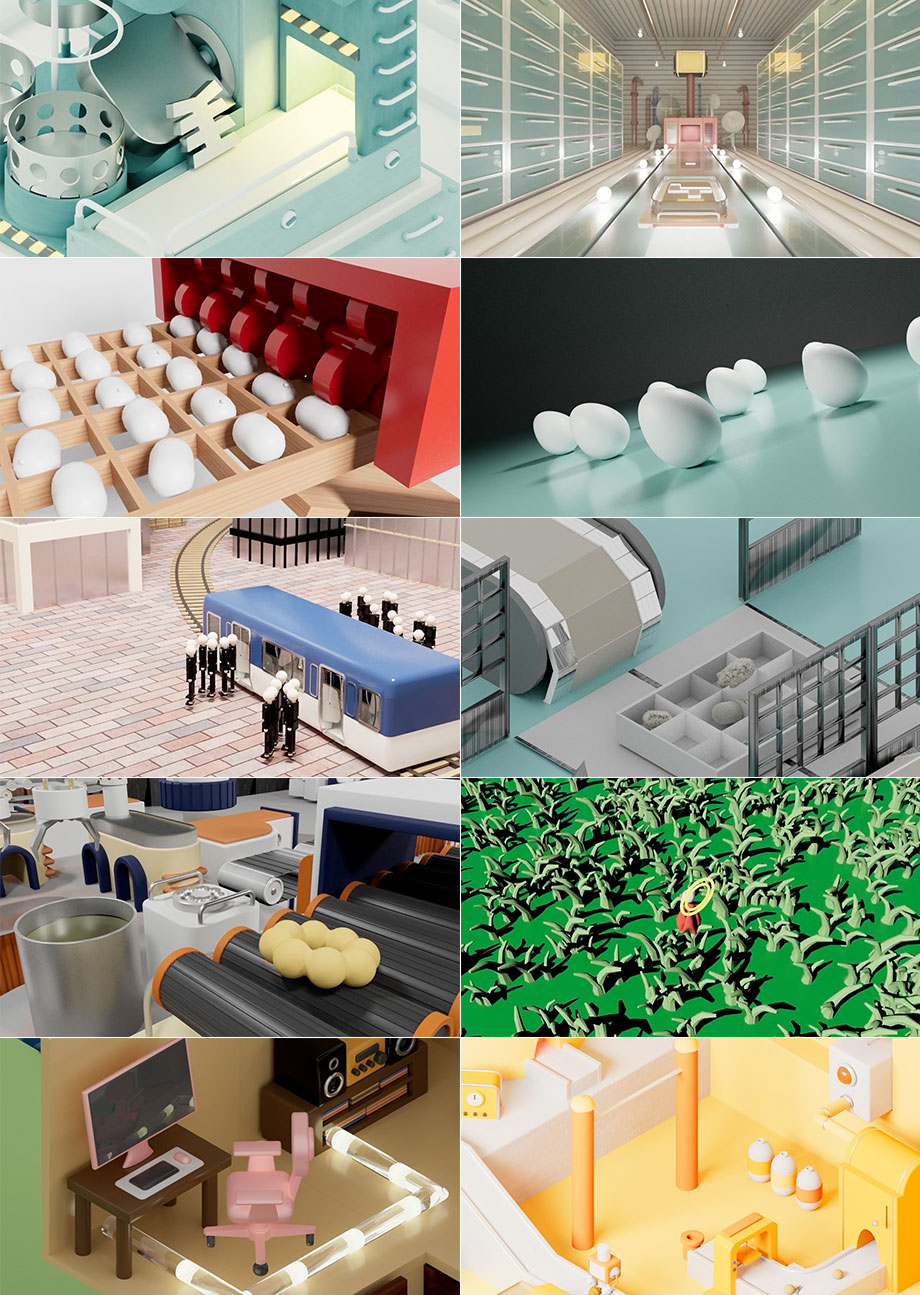 生産という言葉をもとに定義した「難解な構造・状況・機構・システム・流れetc…」を、わかりやすい形状(=モデリング)や動き(=モーション)をベースに映像化しました。