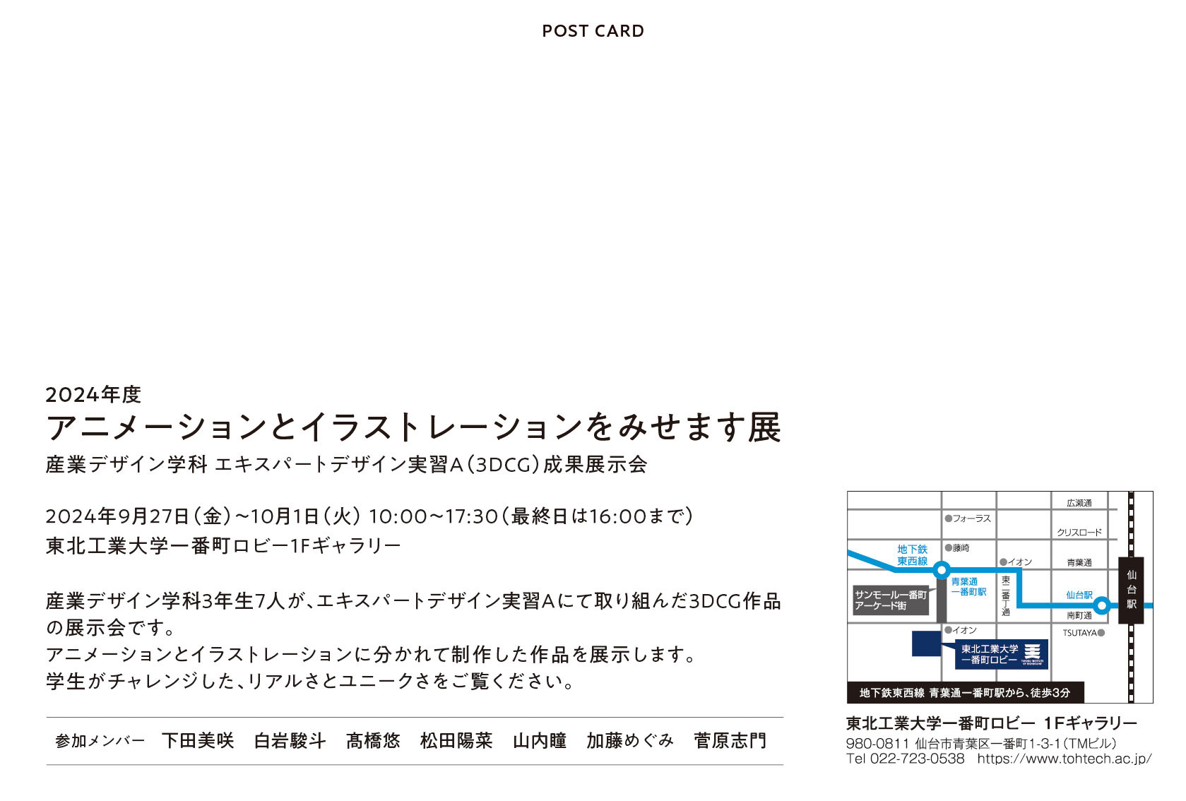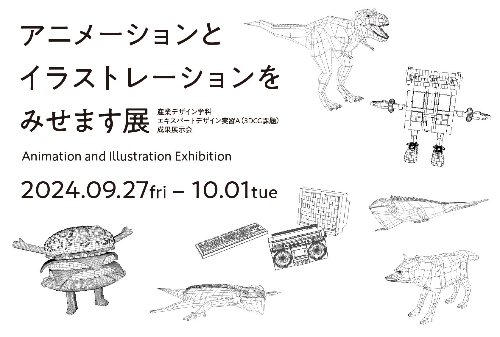 エキスパートデザイン計画および同実習A(3DCG課題)にて、産業デザイン学科3年生7名が取り組んだ3DCG作品の成果展示会『アニメーションとイラストレーションをみせます展』を開催します。