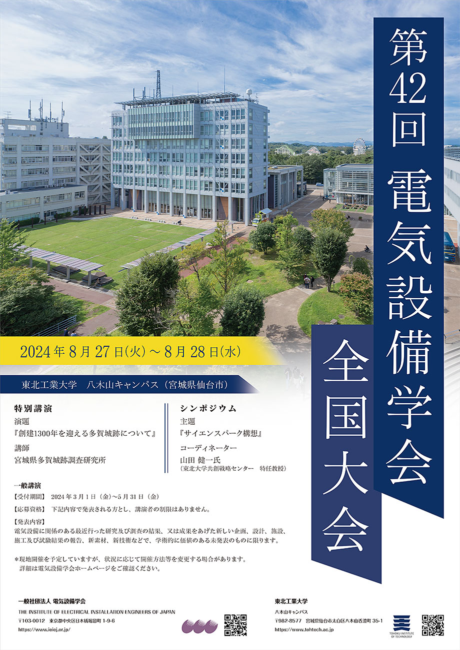 2024夏に本学 八木山キャンパスで開催される電気設備学会のポスターを、産業デザイン学科4年 古川 睦さんが担当しました。