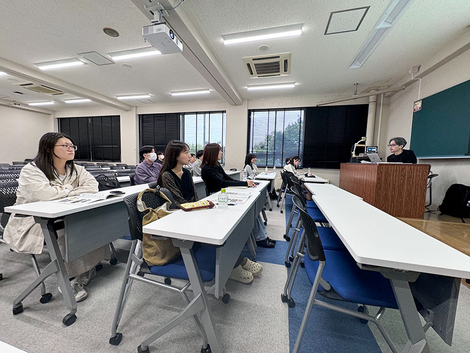 2024年10月7日の授業では、合同会社homesickdesignの代表 清水真介さんにお越しいただき、清水さんが非常勤講師として専門学校で行っている授業や、企業や地域を対象としたデザインを伝える実践、デザイン教育に対する考え方などについて授業をしていただきました。