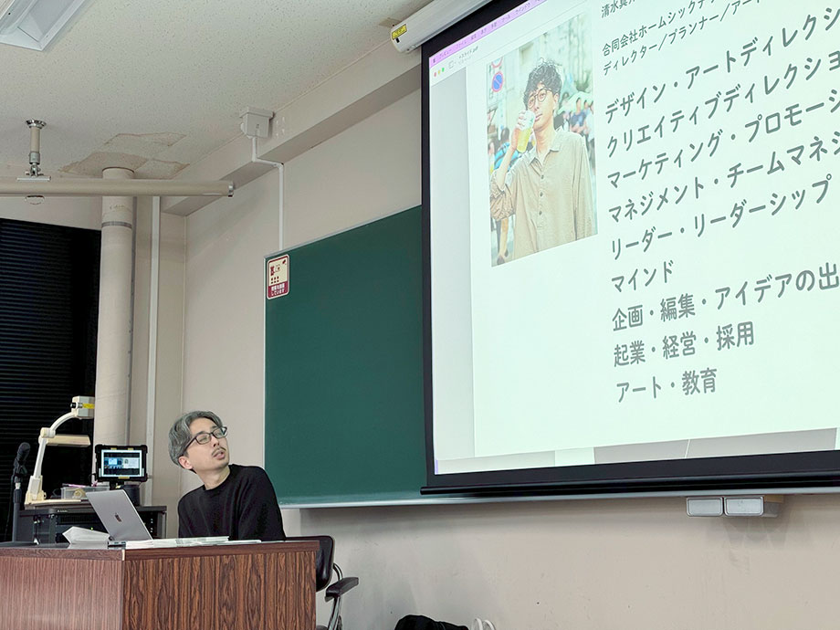 2024年10月7日の授業では、合同会社homesickdesignの代表 清水真介さんにお越しいただき、清水さんが非常勤講師として専門学校で行っている授業や、企業や地域を対象としたデザインを伝える実践、デザイン教育に対する考え方などについて授業をしていただきました。