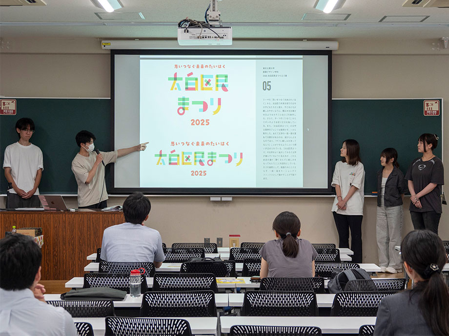 エキスパートデザイン実習A(ローカルデザイン)では、太白区との連携による「太白区民まつりの広報ツール制作とSNS運用」、七十七ヒューマンデザイン株式会社との連携による「地元企業3社を対象とした求人広告動画制作」の2つのプロジェクトに学生たちが取り組んできました。