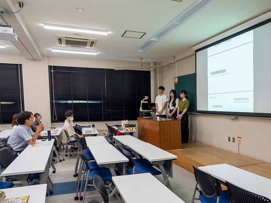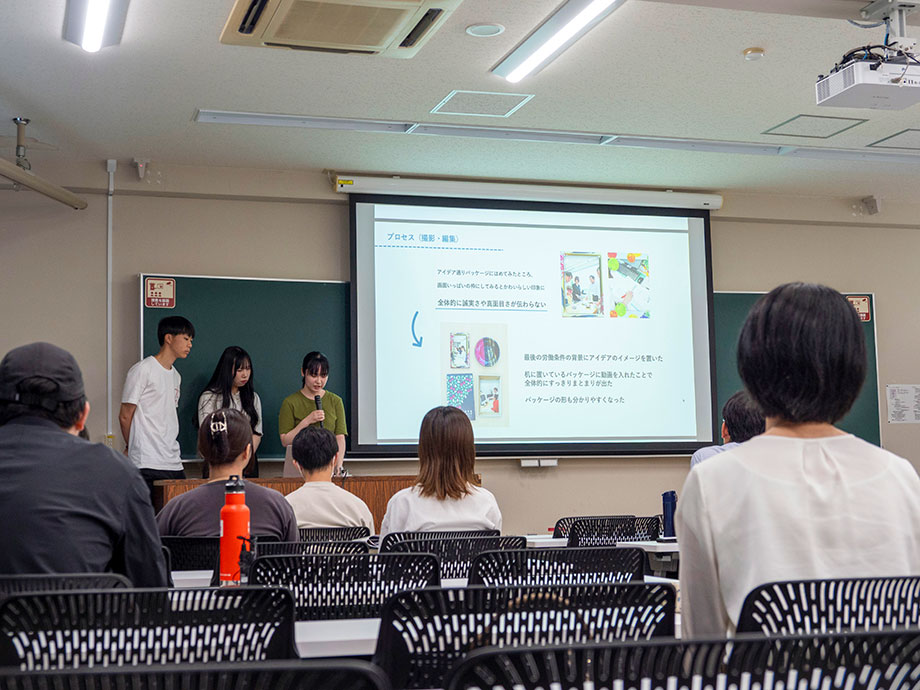 2025年7月23日に、これらのプロジェクトの最終発表会を開催しました。発表会には、七十七ヒューマンデザイン株式会社をはじめ、地元企業3社(三恵商事株式会社、有限会社イデアスペース、株式会社高速)のご担当者様にもお越しいただき、学生たちは、前期の取り組みや制作物についてプレゼンテーションをしました。