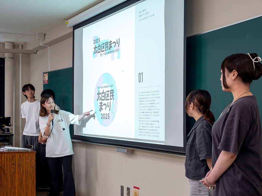 エキスパートデザイン実習A(ローカルデザイン)では、太白区との連携による「太白区民まつりの広報ツール制作とSNS運用」、七十七ヒューマンデザイン株式会社との連携による「地元企業3社を対象とした求人広告動画制作」の2つのプロジェクトに学生たちが取り組んできました。