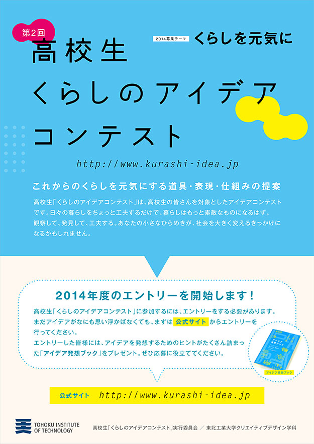 詳しい情報は 第2回 高校生「くらしのアイデアコンテスト」 WEBサイト(http://www.kurashi-idea.jp)にてご確認ください。